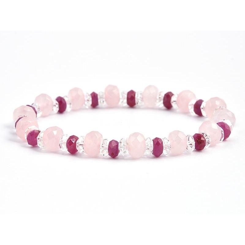 A karkötő 5,5x3 mm-es rubin tárcsa, 5x2 mm-es fazettált hegyikristály és 8x5 mm-es fazettált rózsakvarcból áll, gumira fűzve.