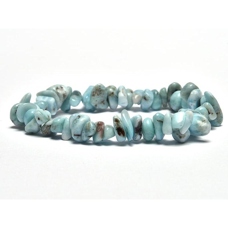 A larimár 0,5-1 cm-es gömbölyített szemcséiből készített karkötő, duplasorosan gyöngyfűtő gumira fűzve. A karkötő hossza kb. 19 cm.