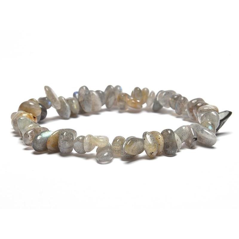 A különleges, opálos fényű labradorit 0,5-1 cm-es gömbölyített szemcséiből készült, gumira fűzött karkötő.