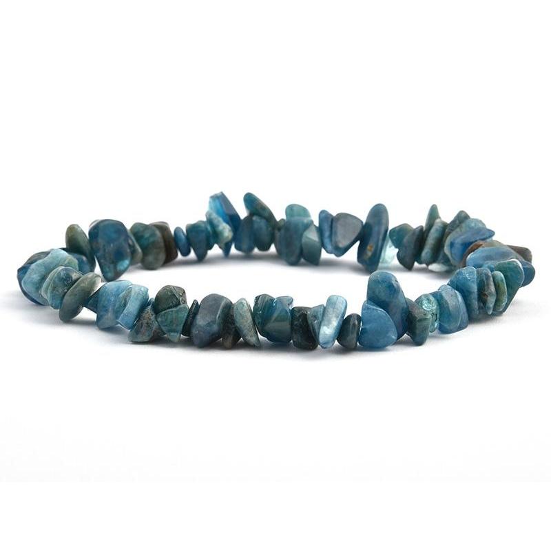 Az apatit 1-1,5 cm-es szemcséit kisebb mértékben gömbölyítették, ezekből gumira duplasorosan fűzött karkötőt készítettem. A karkötő hossza kb. 18,5 cm.