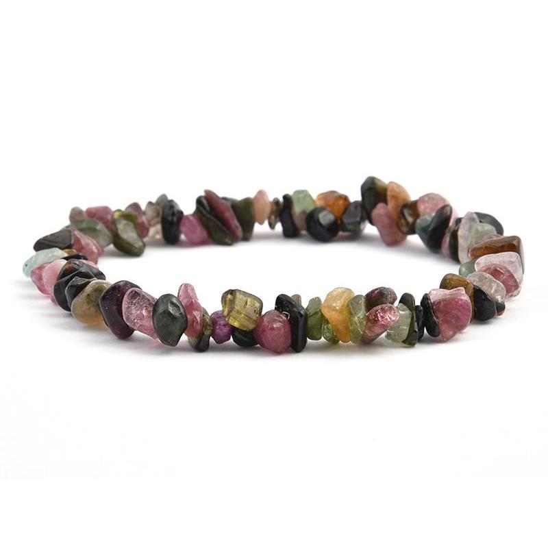 A turmalin többféle színben fordul elő a természetben. A gyártási folyamatok során keletkező  kicsi törmelék szemek éles széleit lecsiszolják és így olcsóbb alapanyagként értékesítik. A karkötő 1-1,5 cm-es turmalin szemekből készült, duplasorosan felfűzve. A hossza 18,5 cm-