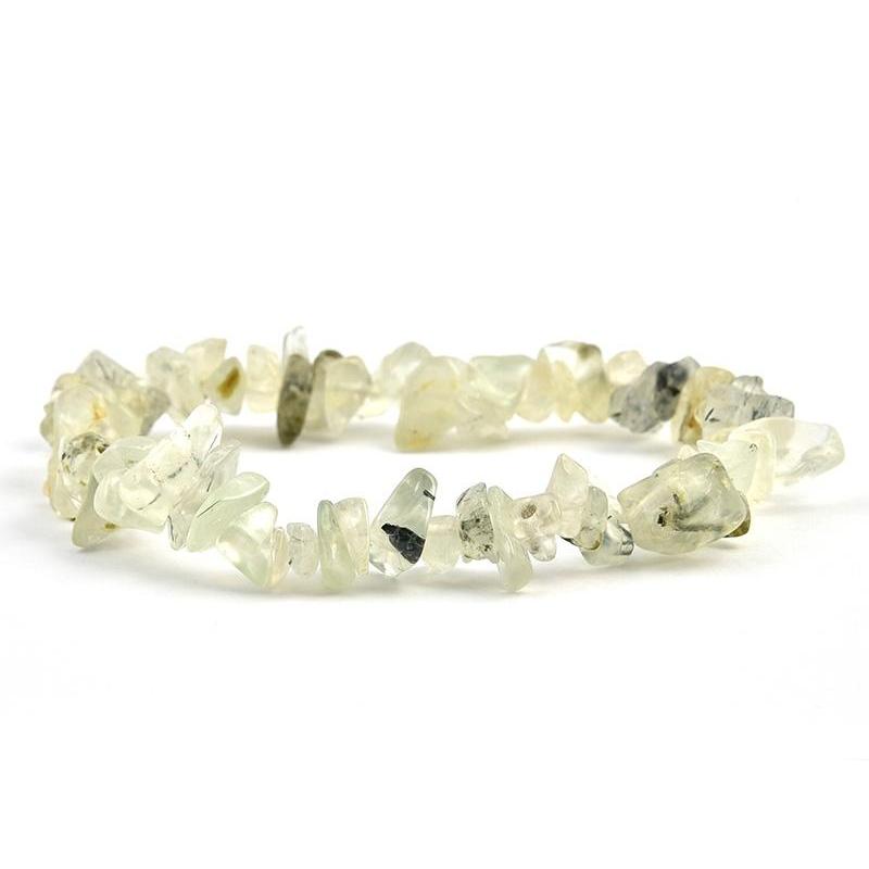 A prehnit 0,5-1 cm-es világoszöld szemcséiből készített gumis karkötő. A hossza 18,5-19 cm.