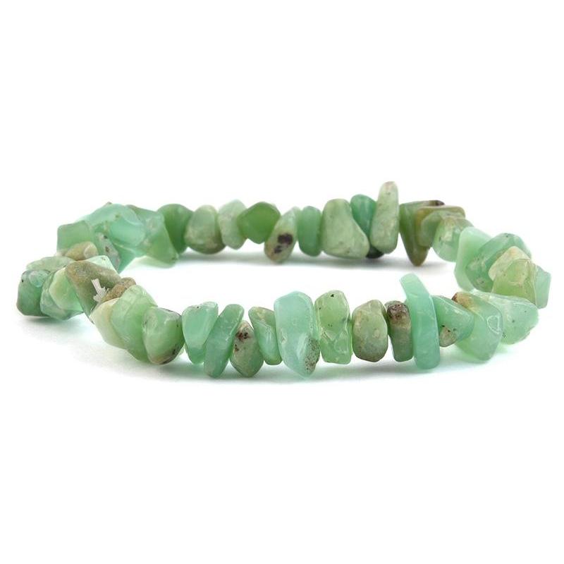 A krizopráz 0,5-1 cm-es zöld szemcséiből készített gumis karkötő. A hossza 18,5-19 cm.