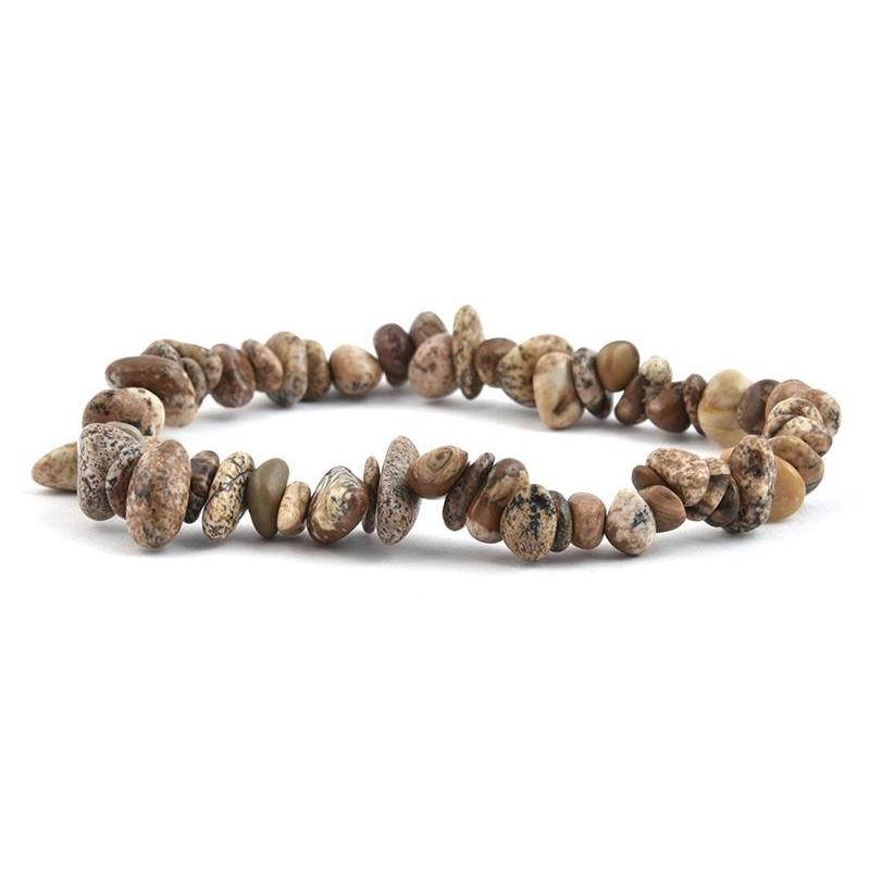 A tájképjáspis 0,5-1 cm-es legömbölyített szemeiből készített gumis, ásvány karkötő. A szemeket duplasorosan fűztük fel. A karkötő hossza 18,5-19 cm.
