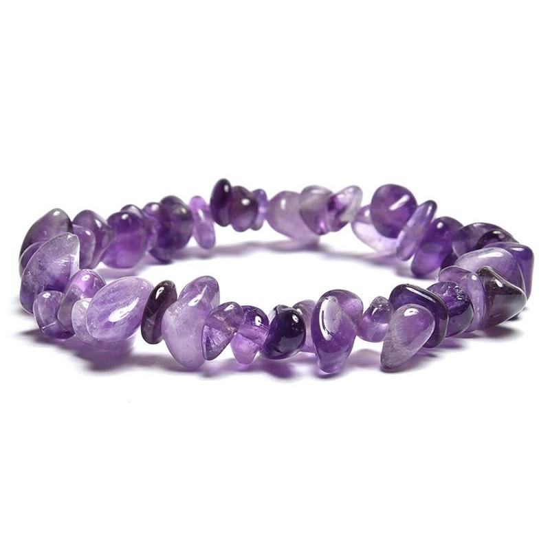 Ez a féldrágakő karkötő szabálytalan 0,5-1 cm nagyságú ametiszt szemcsékből áll duplasoros gumira fűzve.