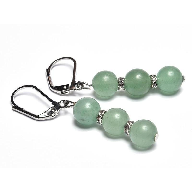 Az aventurin 8 mm-es gömbjeiből készített fülbevaló, amelyet 4 mm-es strasszgyűrűk díszítenek. A fülbevaló teljes hossza kb. 4,5 cm. Antiallergén.