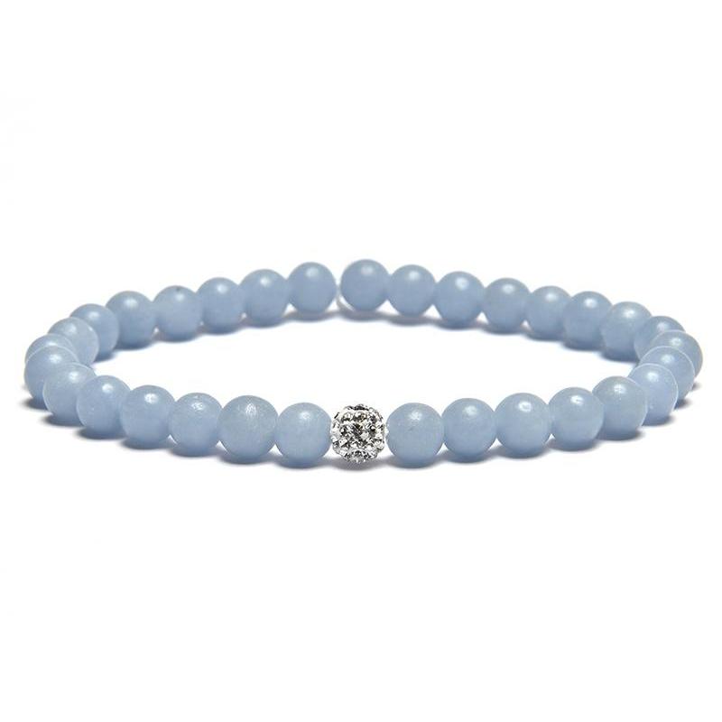 Az angelit 6 mm-es gömbjeiből készített karkötő gyöngyfűző gumira fűzve. Díszítőelme : 1 db 6 mm-es extra minőségű, antiallergén strasszgolyó.