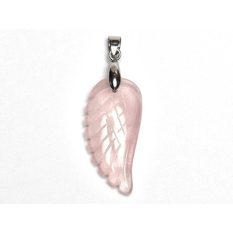 Rózsakvarcból készült 3x1,5 cm-es metszett angyalszárny. Antiallergén fém medáltartóval együtt a magassága kb. 5 cm.