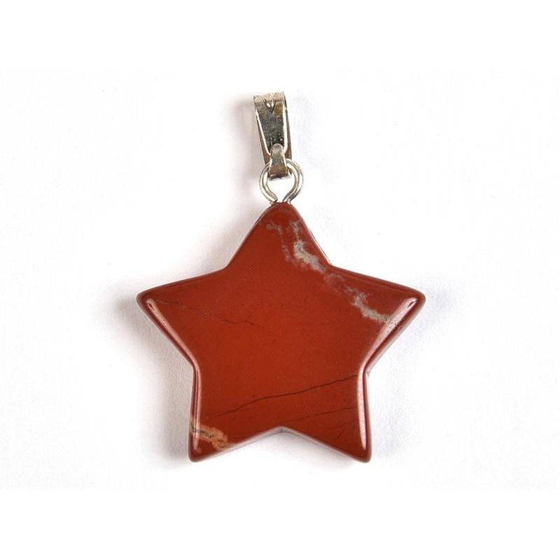 A jáspis csillag medál nem egységesen téglavörös színű, hanem a megfigyelhető benne szürkés kalcedon erezet. Magassága a fém alkatrésszel ( antiallergén ) együtt kb. 20 mm.